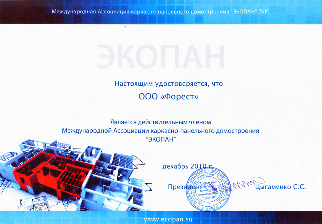 Сертификат удостоверяющий действующее членство Международной Ассоциации каркасно-панельного домостроения «ЭКОПАН»